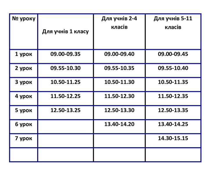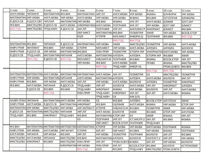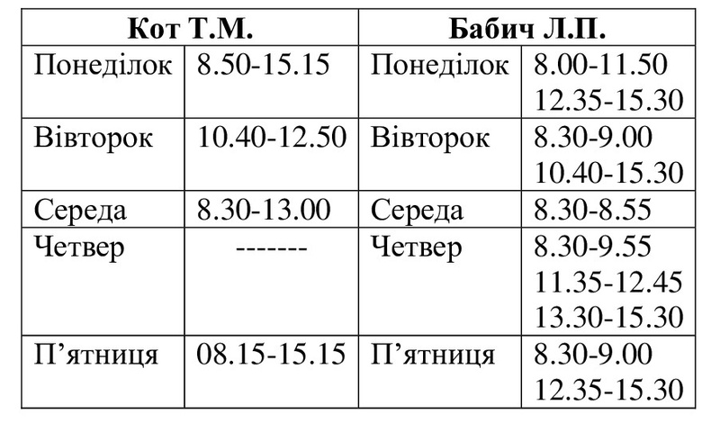 П’ятниця з 7.30 до 9.00, з 11.30 до 11.50, з 14.20 до 15.00, з 15.20 до 16.40 (за межами закладу)